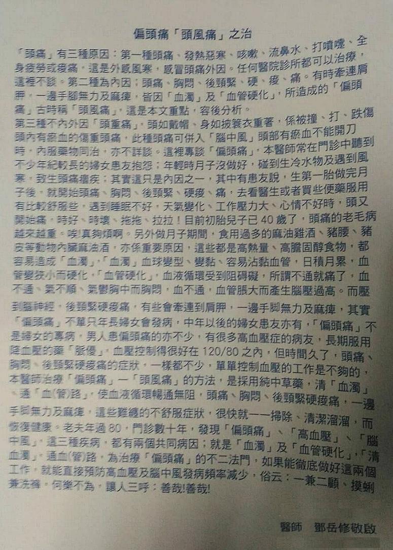 (管),使血液暢通無阻年久不癒的偏頭痛,很快就清除了。