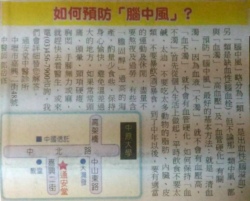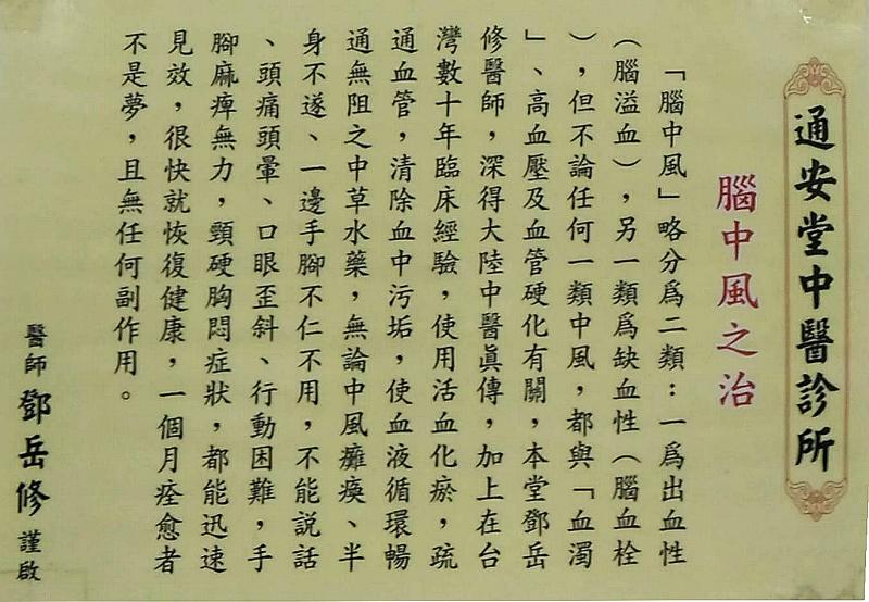 腦中風癱瘓、不能說話、一邊手腳不能動、或腦部有血塊、不能開刀時,請試試中醫,通安堂熱誠為你服務,老醫師親自為你把脈、處方、調劑。